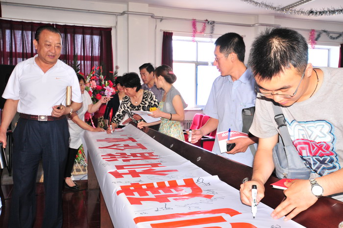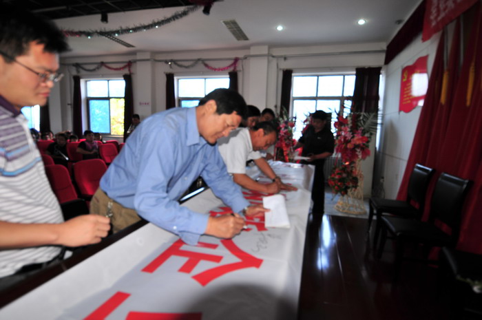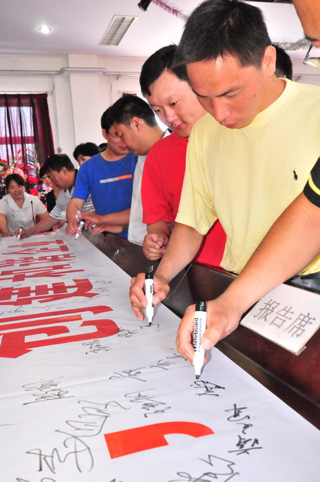參會人員在“科學發(fā)展,安全發(fā)展,創(chuàng)建和諧企業(yè),從我做起”條幅上簽字